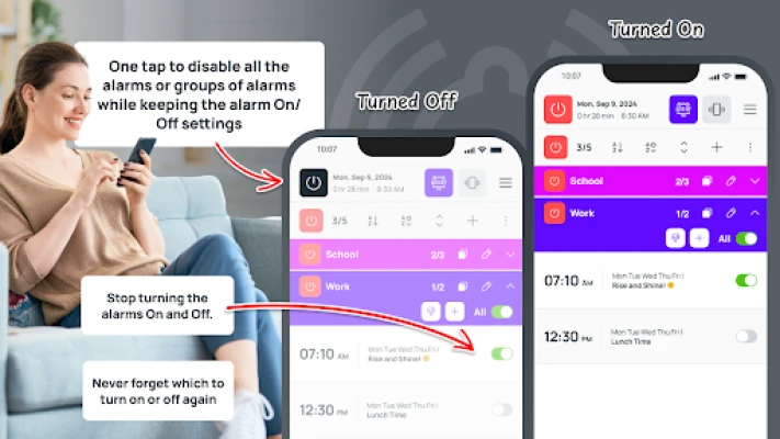 Time management should be simple, and this alarm reminder makes that a reality. The one-tap feature gives you full control over all your alarms. No more guessing which alarms are on or off; with a single tap, you can activate or deactivate entire alarm sets, ensuring you're always prepared for what's next. Whether it's setting alarms for weekday meetings or turning off reminders for a relaxing weekend, an alarm organizer makes it quick and convenient.