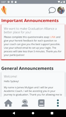 As a Graduation Alliance student, you can access your school portal to check class progress, get the latest updates, and chat with your support team. This app does not allow you to access assignments or complete coursework, this can only be done using the web portal.