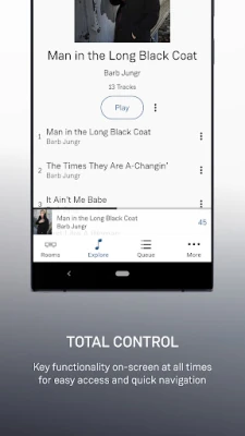 An enhanced Now Playing view displays beautiful, large-format album artwork, and includes all transport and volume controls on a single, uncluttered screen.