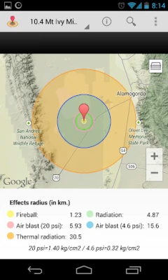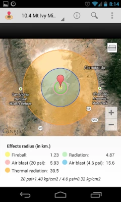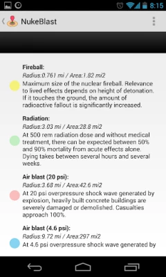 Want to know the effects of a nuclear explosion on your home town? With this app you can find out how much damage a nuclear weapon would cause. Shows the level of destruction and affected area that would be caused if the bomb was dropped by a ground-level detonation.